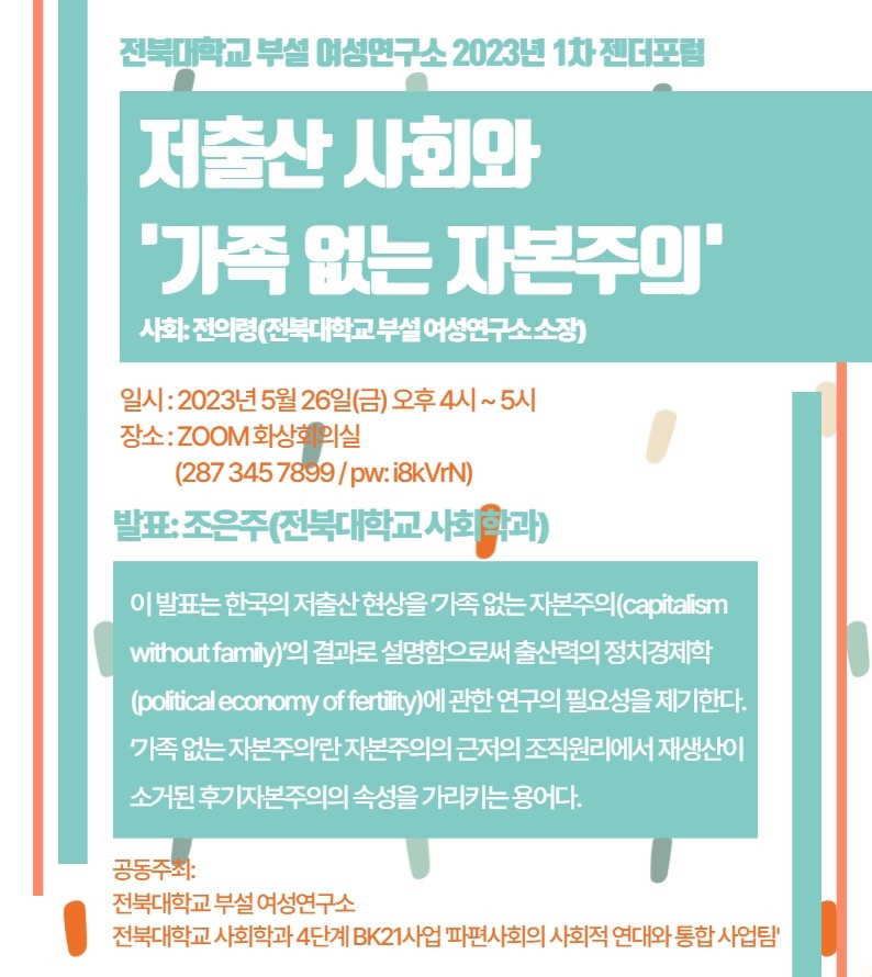전북대학교 부설 여성연구소 2023년 1차 젠더포럼: 저출산 사회와 '가족 없는 자본주의'